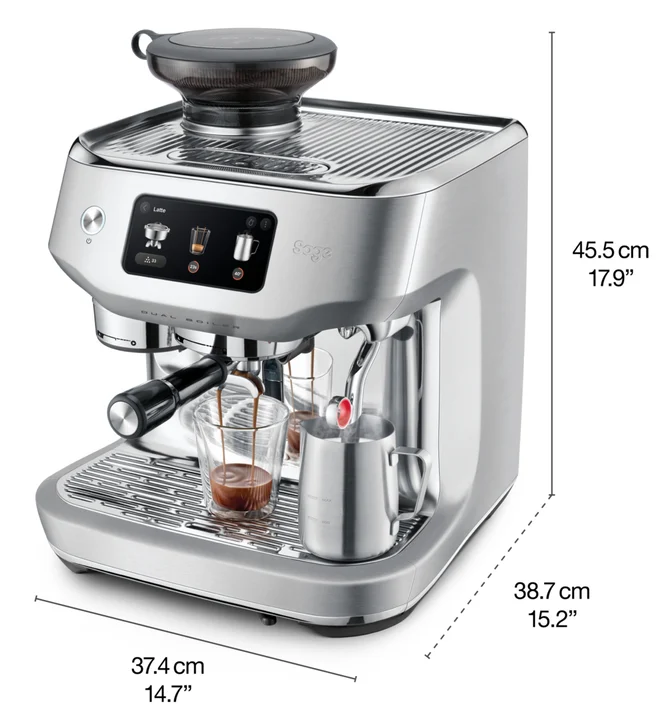Die Sage Oracle Dual Boiler ist eine High-End-Siebträgermaschine, die mit einigen smarten Features punktet. Dank ihrer umfangreichen Assistenzsysteme erleichtert sie Einsteigern die Nutzung erheblich, während erfahrene Baristas in den manuellen Einstellungen ihren Vorlieben bei der Feinjustierungen voll ausleben können. Das große Touchdisplay und die integrierte Mahlwerk- und Tamping-Technologie sorgen für eine bequeme Handhabung und präzise Espressoergebnisse. Diese Maschine ist ideal für Haushalte, die eine moderne Kaffeeerfahrung für daheim suchen und bereit sind, dafür etwas tiefer in die Tasche zu greifen.Vorteile